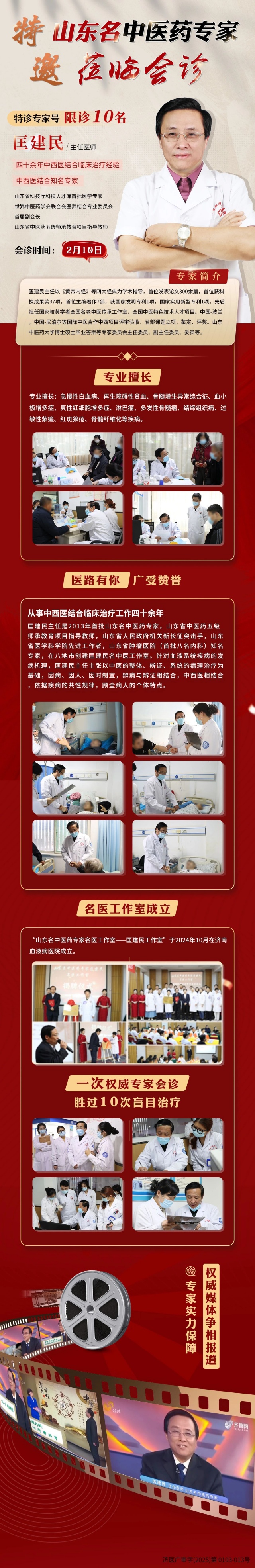 在春意渐浓的时节,济南血液病医院将于2月10日—11日,特邀山东名中医药专家匡建民主任(2.10日)五代中医世家传承人史培泉主任(2.11日)莅临我院开展联合会诊活动。届时将携手我院血液病专家团为广大患者带来一次优质的诊疗服务。此次联合会诊,旨在整合本地的优质医疗资源,为患者搭建起一个与名医面对面交流的平台。会诊期间患者朋友无需为看名医而各处奔波,提前预约享受知名中医专家的精湛医术和贴心服务。