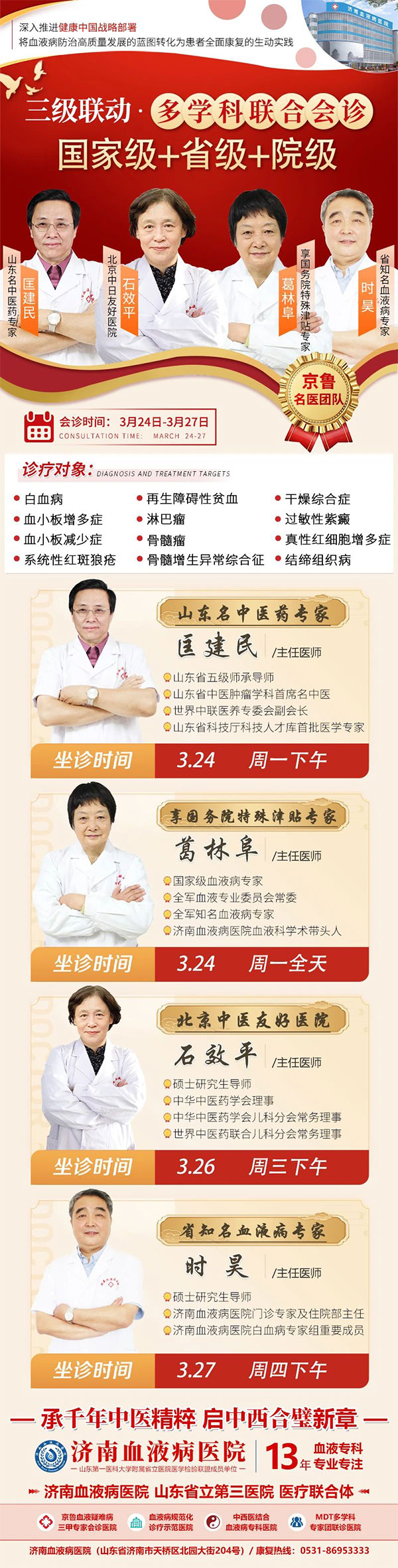 本次“京鲁名医联动+中西医双轨攻坚”的联合会诊将于3月24日正式开启,京鲁三甲名医强强联合,覆盖血液病全病种诊疗,机会难得,很多患者慕名而来,预约火爆,请有需求的患者尽早预约。